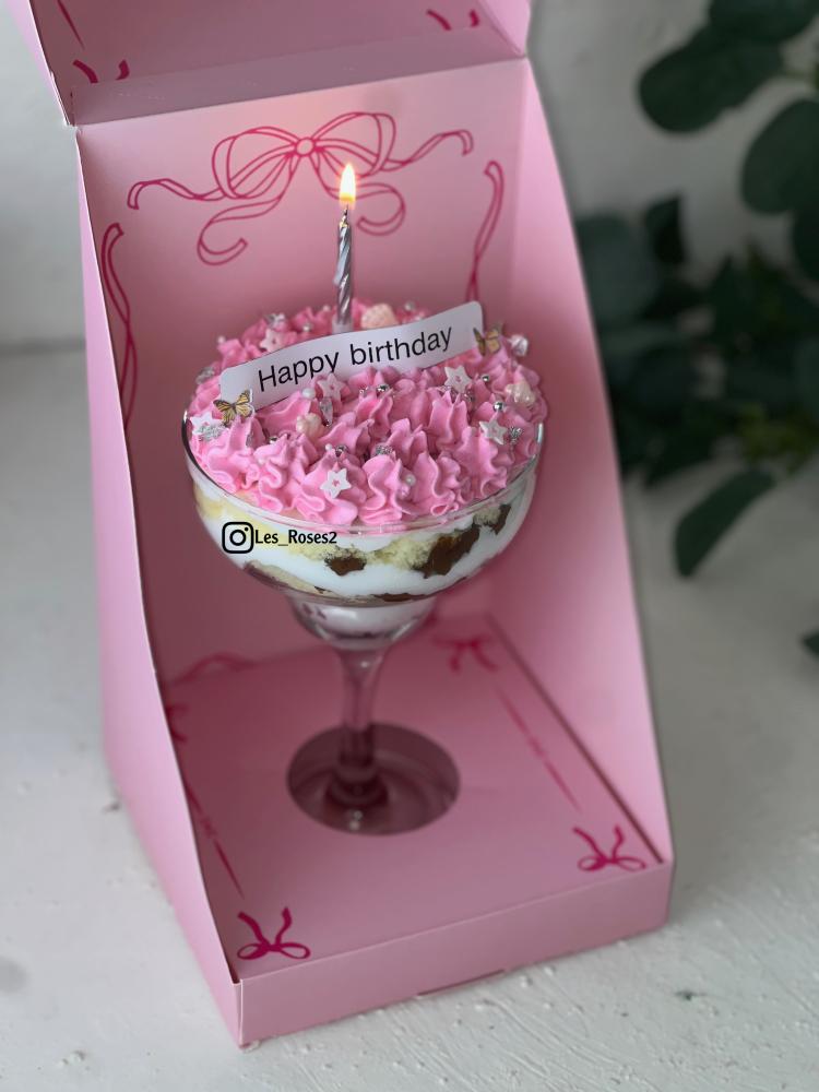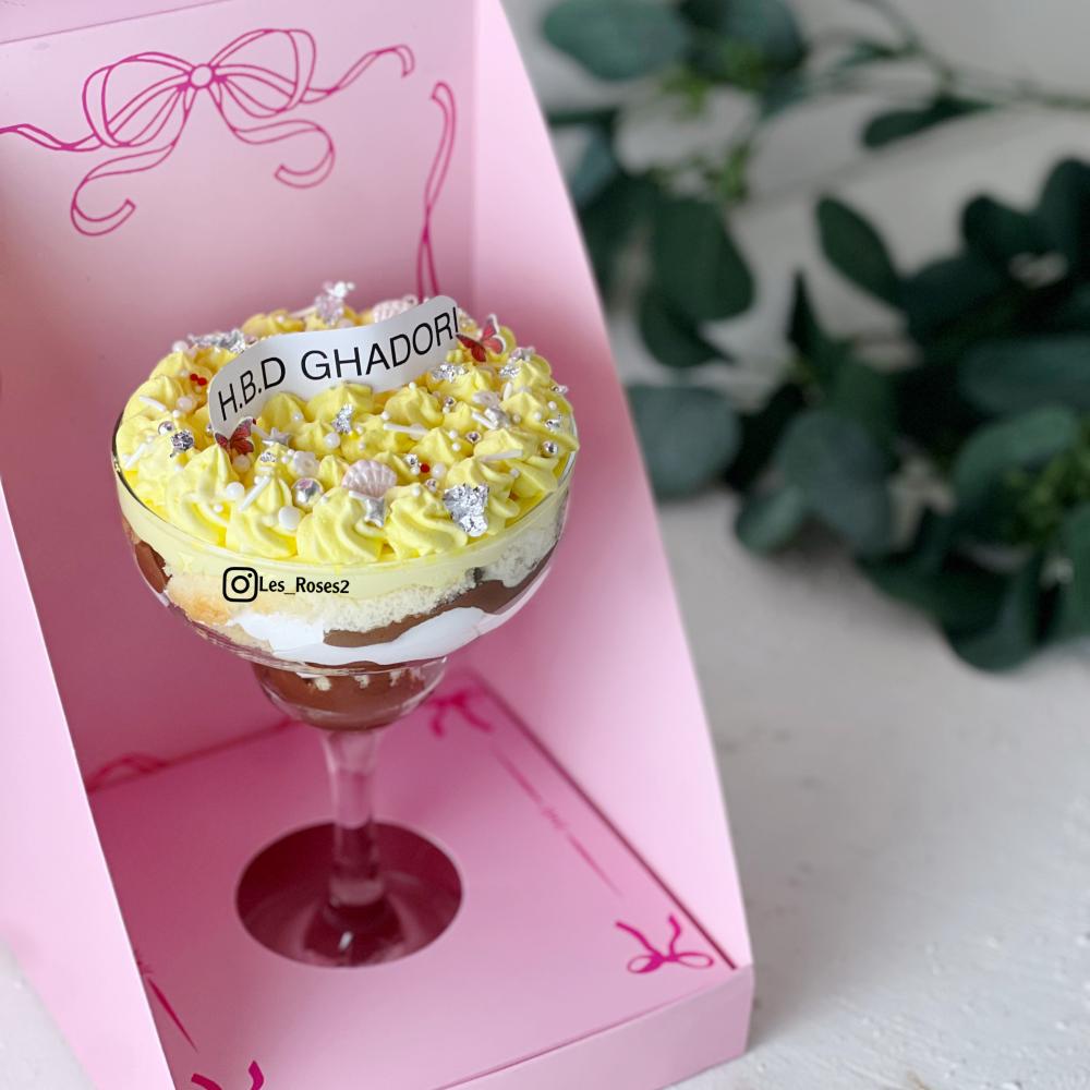 كيك بطبقات لذيذة من الكيك والكريمة، يُقدَّم في كاسة زجاج أنيقة قابلة لإعادة الاستخدام.